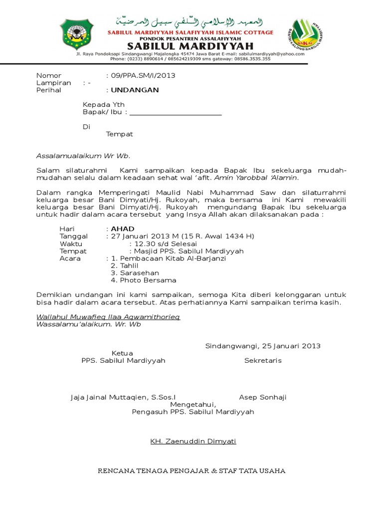 Contoh Surat Undangan Maulid Doc : Contoh Surat Undangan Tahlil 40, 100, 1000 hari (haul).doc - Berikut kami berikan contoh surat undangan resmi yang bisa dijadikan referensi dalam pembuatannya.. Undangan acara maulid nabi muhammad saw. Beberapa diantaranya adalah surat undangan pengajian akbar, pengajian rutin, pengajian pernikahan, pengajian maulid nabi, pengajian umum, pengajian syukuran, dan lain. Begitu juga dengan cara penulisannya? Kepala surat yang berisi kop surat seperti biasa yang menunjukkan identitas yang mengundang. 0 ratings0% found this document useful (0 votes).