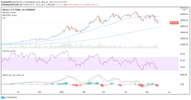 Bitcoin rebounded as the day went on, was down 12% to about $38,205.49 shortly after 3 p.m.